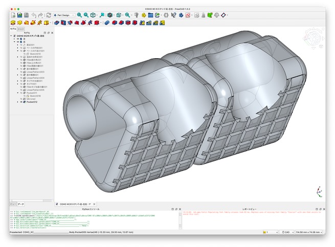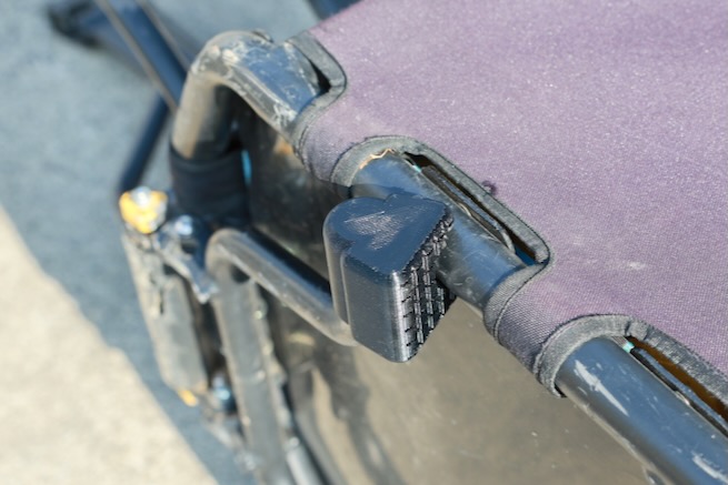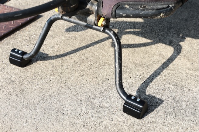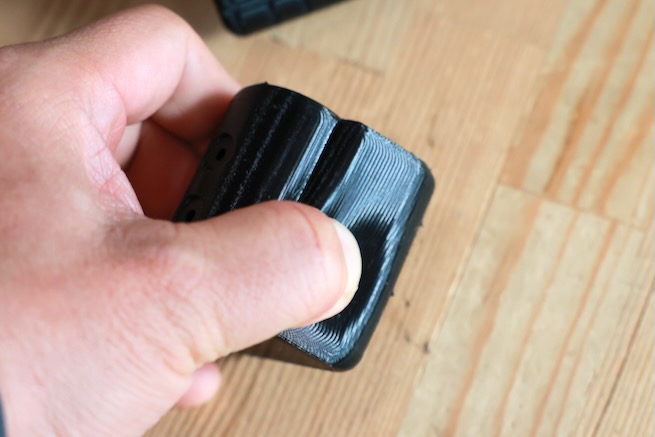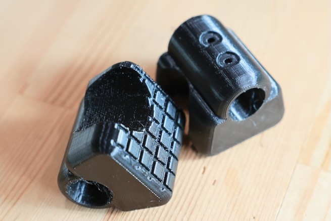 これまでCOHO XCのスタンドの高さにはビミョーに悩まされてきた。RZ120で牽いてた時は何も問題なかった。ところがTRS2AMになったら27.5インチなので後輪の中心は高くなる。COHO XCのスタンドは高さを変更できる仕組みになっているが。一番高くした状態でわりとギリギリ。 その状態からCOHO XCのショックをエアショックに変更した。元のスプリングの軸長は5.5インチだが、そんな軸長のショックはもうない。なんとか6インチを入手して使った。つまりリアが少し上がる。その時点でスタンド高さは僅かに足りないぐらいになった。少し荷物を入れれば沈んで設置するので、どーにか誤魔化して運用。 そしてトドメがTRS2AMのタイヤを2.8インチ幅に変えたこと。TRS2AM側の接続部分の高さが少し上がり、これでCOHO XCのスタンドは長さがどーにも足りなくなった。仕方ないのでスタンド足の部分にチューブを輪切りにしたものを多重に被せて太くして誤魔化した。それでも空荷に近いと浮いてしまってグラグラ。 ズルズルとその状態で運用していたが今年は心機一転。ちゃんと嵩増しした足を作ることにした。モデリングしてTPUフィラメントを使って少し柔らかさがある感じに出力。 TPUはゴムのような摩擦力が出ないので接地部分はパターンをつけて引っかかり力が出やすいようにした。重量がかかればザラザラしたアスファルトとかの路面ではグリップしてくれると思う。大きな切り欠きはスタンドを格納した時の干渉を逃す部分。 いろいろ調整して、しっかり感を出しつつ強く握ると歪む程度の柔らかさにした。荷重がかかると歪むのでグリップ力が出やすいし、ガツンとぶつけても衝撃吸収してくれる。 標準の足。ゴムなのでグリップはいいが、高さがまったく足りない。これにチューブの輪切りを重ねて10mmぐらい嵩増しして使っていた。でも、使ってると底の部分は擦れてチューブ破れてきて補修が面倒だった。 作ったTPUの足を装着。固定ネジは脱落しないように2個にした。15mm高いので空荷状態でもちゃんと足が地面につく。安定感バッチリ。材質的なグリップ力はゴムより弱いけど荷重かかるのでコンクリやアスファルトでの摩擦力は十分出てるので問題なし。 切り欠き部分の役割はこれ。スタンドを格納した時に先端部分は本体フレームに干渉する。切り欠きてパイプを避けてスタンドが水平になるまで格納できるようにした。チューブで嵩増ししてた時は干渉してナナメになったまま使ってたので、これでスッキリ。 |