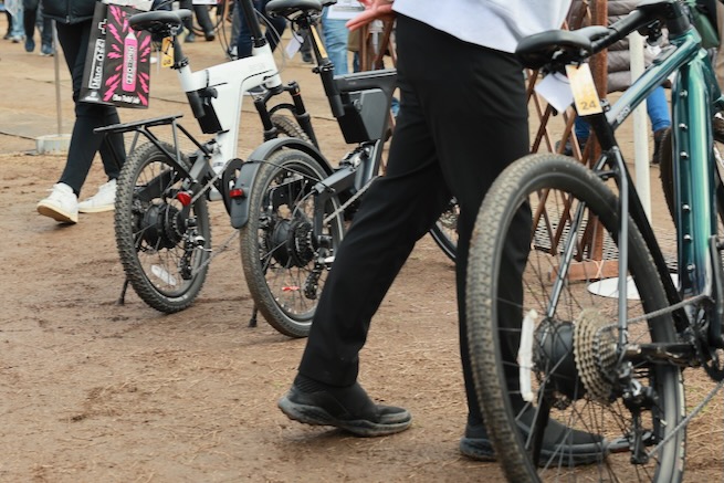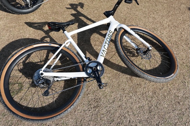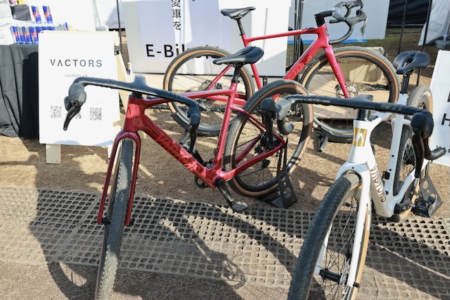 ライトは標準装備。点灯状態を見る限りでは本気でナイトランするライトではない。塗装とかロゴとかはそれなりに拘ってそうな感じ。 乗ってみるとアシストは静か&滑らか&パワフルで良い。ヤマハのドライブユニットはよくできている。車体全体の印象は個人的にはビミョー。MTBというよりは重たいクロスバイクをちょっとオフに振ったような感じ。重量あるのにリアサスなしでタイヤのエアボリュームも少なめなのでゴツゴツ感が大きい。 もっと太いタイヤを入れてエアボリュームを増やしてエア圧を下げれば乗り心地良くなるかも。街乗りメインで休みの日にちょっとダート入るかも?ってぐらいの使い方ならアリかもしれない。 フルカーボンで11.7kgって書いてあるブース発見。クラファンでの販売のようだが、フルカーボンでバッテリー内蔵+ハブモーターのグラベルロード。試乗できるか聞いたら予約は詰まってるけど、たまたま次の人が来てないから今ならOKってことで乗る。