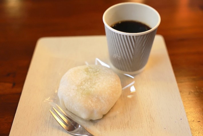 食後にコーヒーとケーキのセット。ケーキといいつつシャインマスカット大福を選択。妙にボリュームあってお腹パンパン。
