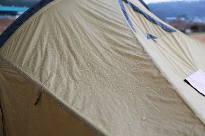 シェルター設営してたら突然真っ黒な雲が流れてきて豪雨&暴風。設営しかけのシェルターに荷物放り込んで退避。間一髪でびしょ濡れにならずにすんだが雨予報なんかなかったぞ、、、バサバサと暴れるシェルターを中から補助しつつ雨雲が通り過ぎるまで耐える。新設した煙突穴のマジックテープ部分から雨漏りがポタポタ。まだ雨対策してないのにいきなり過酷な雨テストとなった。