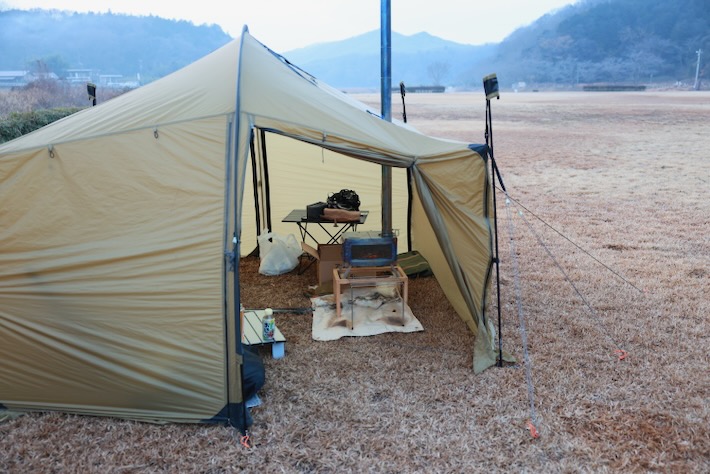 新設した煙突穴との位置関係はちょうどいい。今までは真ん中寄りの天窓から出してたのでストーブが中心に鎮座してしまい都合が悪かった。端の方に煙突穴を開けたことでストーブが壁寄りになって中を広々と使えるようになった。