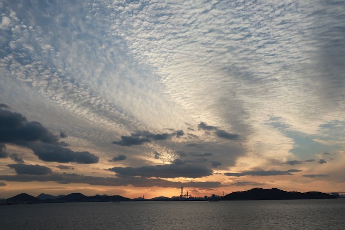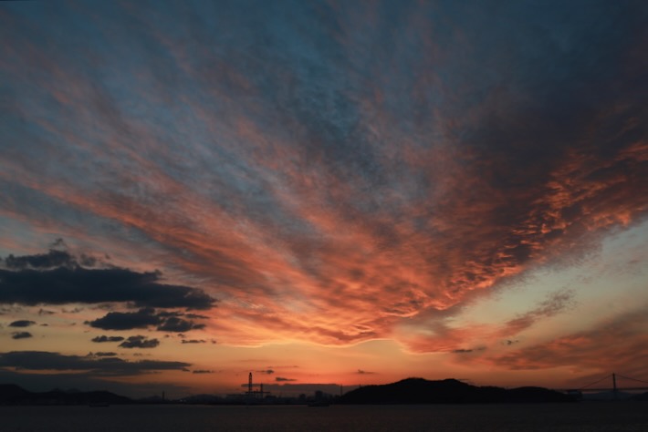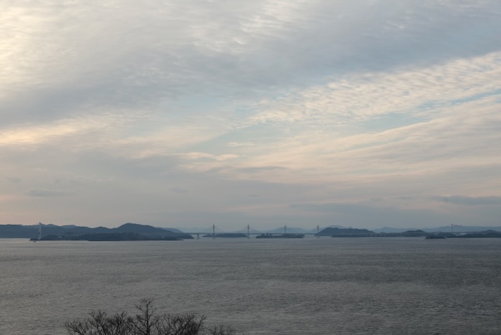 2025年最後の夕日はちゃんと下まで見えた。瀬戸大橋と重なって走ってる車の影が見えてなかなかエモい。