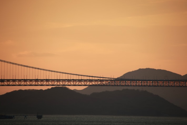 瀬戸大橋が夕日に照らされて赤く染まる。