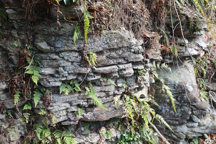 五色台の上の方をうろつくと見かけるこれ、今まで地層かと思っていたが、これは板状節理(ばんじょうせつり)のようだ。地層は横筋ごとに色や質が違うのに対して、これは全部同じ色と岩なので一塊の岩が規則正しく割れたもの、つまり板状節理。さっきの常設展示でちょっと利口になった。