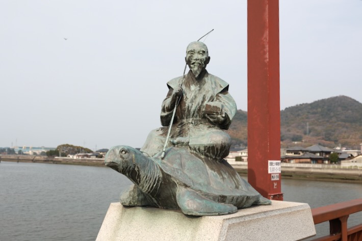 いつもの浦島太郎の銅像。老人になってるから玉手箱を開けた後のはずだが、手には玉手箱を持って亀に乗ってる。時系列メチャメチャでわけわからん。